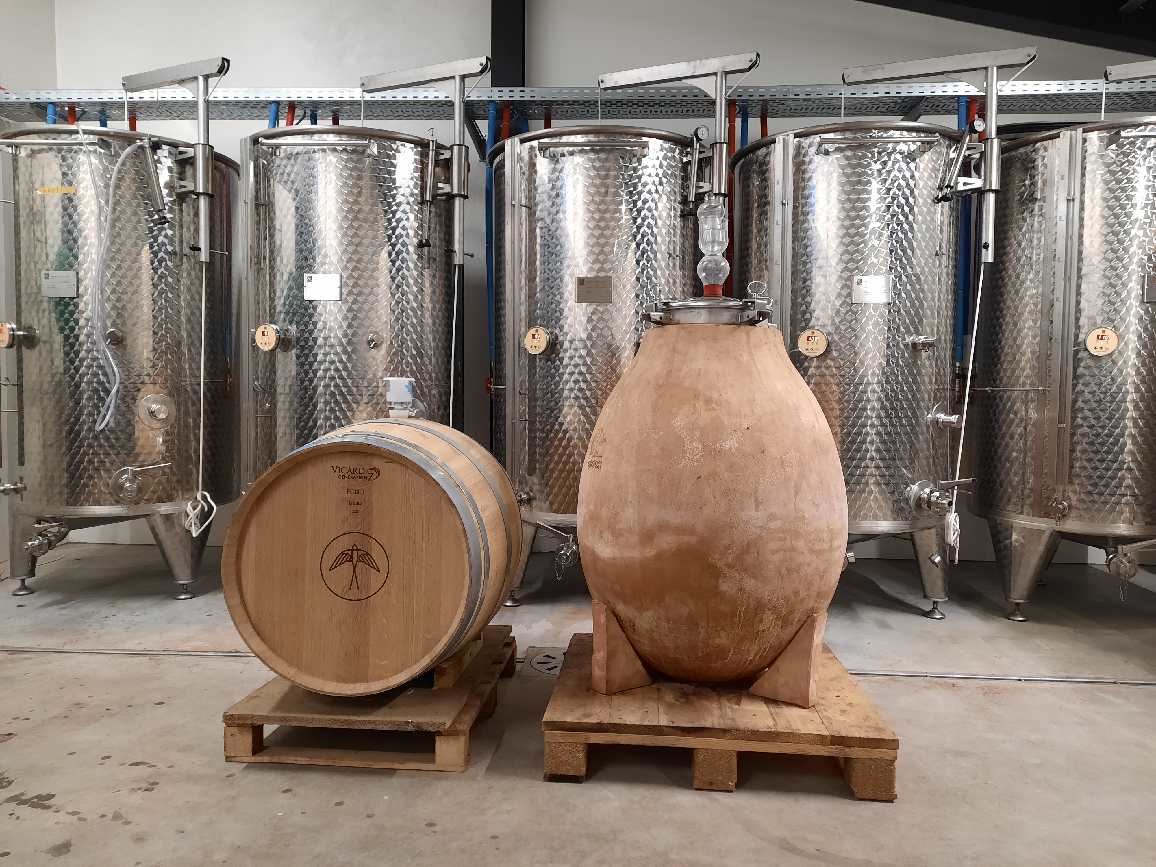 Pieter-Jan en Jeroen experimenteren volop met verschillende methodes om wijn te maken. Naast traditionele eiken vaten en inox cuves, wordt voor de rode wijn gebruik gemaakt van Italiaanse amforen.